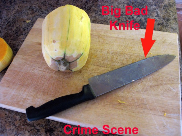 I have a dull knife (not worth getting into this, but I’ve known for some time that my big knife needs to be replaced and I truly intend to do it very soon).  Not so dull, however, that it doesn’t cut through something fleshy.  Not fleshy like squash, but fleshy like my finger.