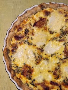 - Distribute bacon evenly on the prepared crust, and pour egg mixture over it. Top with goat cheese.